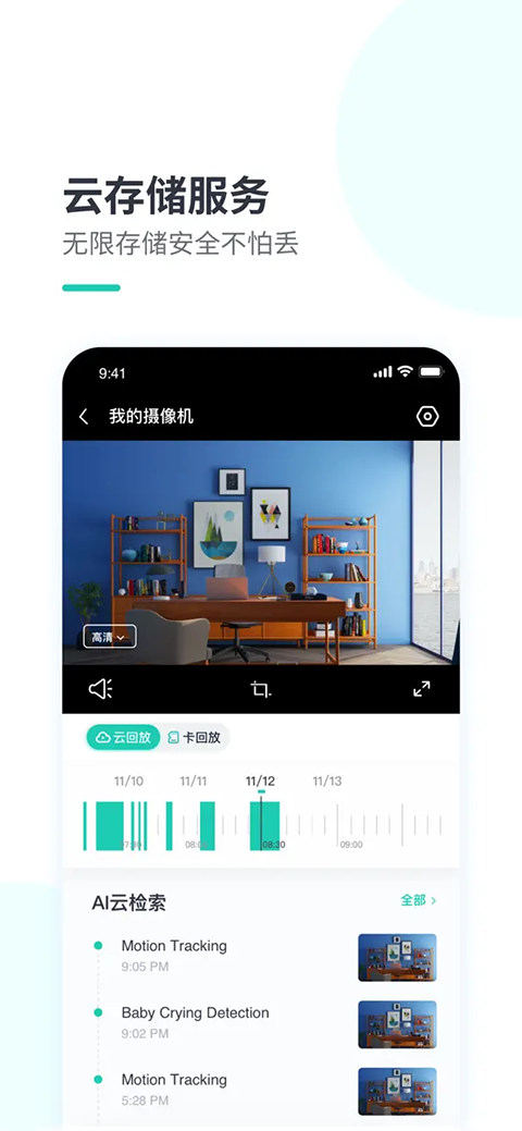 4、云存储服务,让您无需担心视频数据的丢失。只要摄像机工作正常,所有录制视频都会上传到云端,让您随时随地查看和下载。