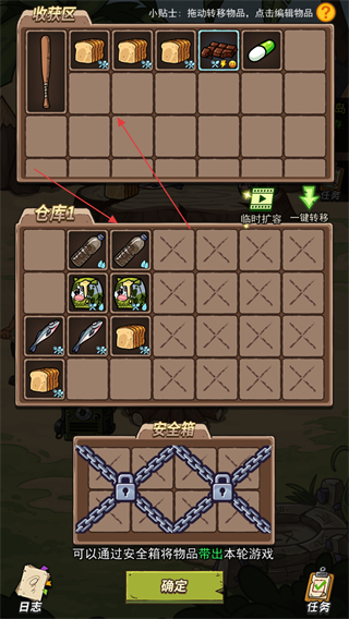 4、探险结束后会获得各类物资这些物资会进入收获区,可移动到仓库中进行分类存储,也可以通过安全箱将重要物资带出本轮游戏。
