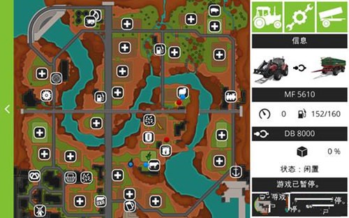 1、游戏中我们要控制各种农用车辆和工具来工作,首先就是控制收割机,将屏幕右边的推杆向上推,收割机就会向前行动,推杆向下推到红色区域,收割机就会后退。