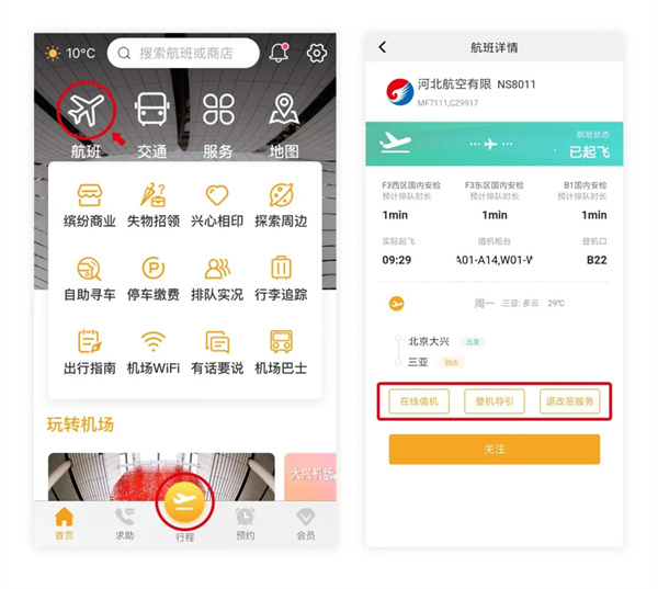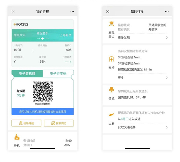 关注航班后,点击首页"行程"即可查看从出发、值机、安检等全流程信息,还可以发现周边景观和美食哦