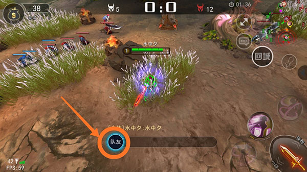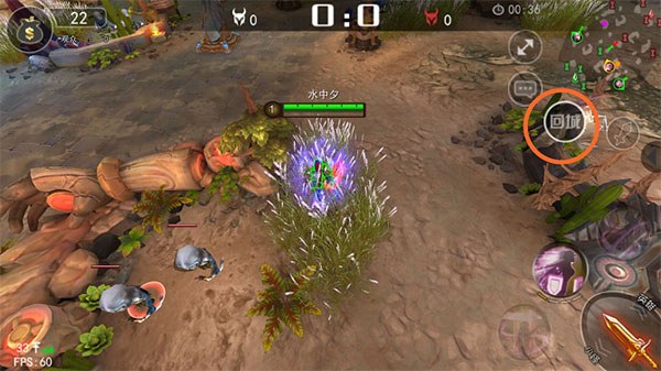 进入草丛后,会出现“回城“二字,如图,点击后,几秒钟后便可到己方泉水。
