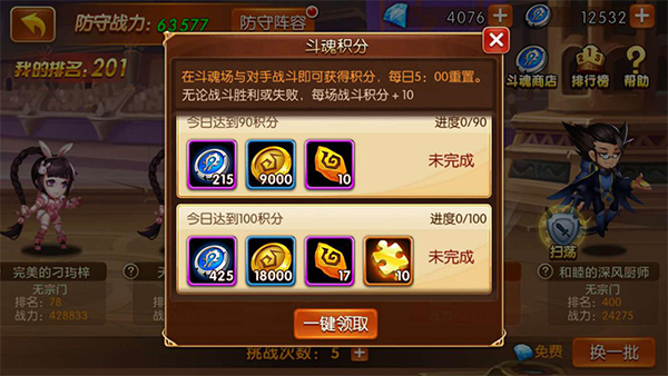 4)每天22:00会按照当前的斗魂场排名,为前1000名发放奖励,包括斗魂币、钻石、金币和培养道具。
