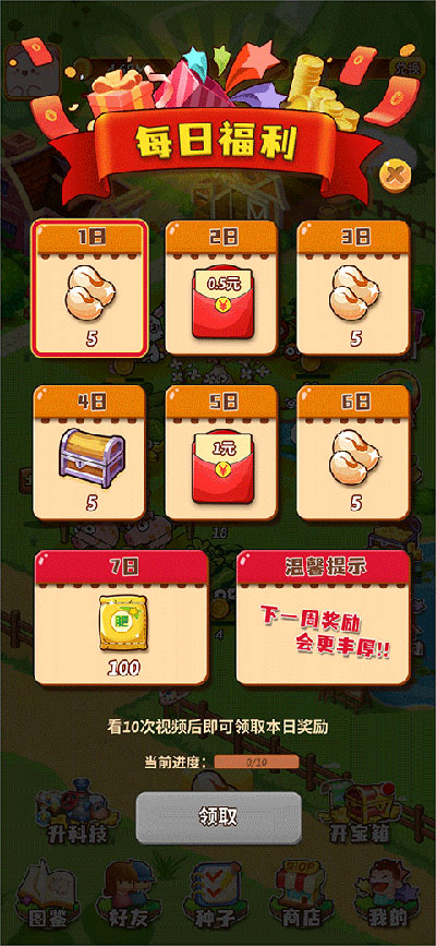②应该是以后很长一段时间的主要玩法了,土地升满,图鉴开满,每天收割一次,算上各种加成,每天能赚几十种子,这种玩法算起来要投的钱并不多,算是一个长期低保。
