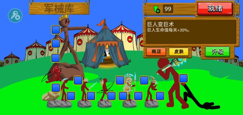 1、游戏中玩家将亲临激烈刺激的战场,指挥你的火柴人勇士进行作战,而且游戏中有着各种火柴人士兵可供训练。