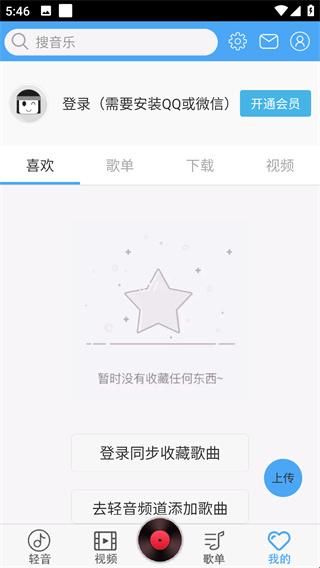 4、点击下方工具栏我的,可以登录后查看喜欢、歌单、下载和视频等信息。