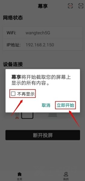 3.会弹出一个“幕享即将开始截取屏幕”的窗口提示,需要点击立即开始,如果你不想每次投屏都弹出,可以勾选“不再显示”。