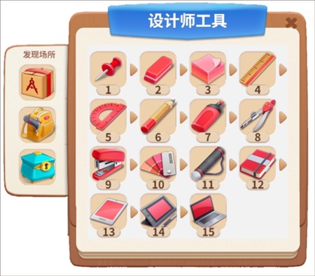四级背包点击得到工具后就可以开始合成设计师工具:2个图钉→1块橡皮擦;2块橡皮擦→1叠便笺;……以下类推。