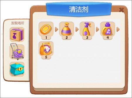 四级清洁车点击得到工具后就可以开始合成清洁剂:2块肥皂→1瓶洗洁精;2瓶洗洁精→1支清洁喷雾;……以下类推。(清洁剂产出概率比清洁工具低)