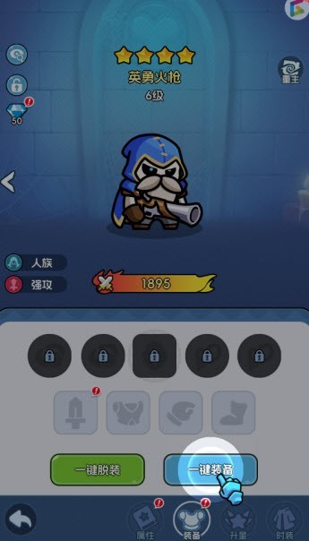 5、点击一键装备,将装备都穿上,也可以大幅度提高战力。