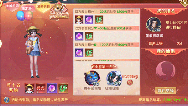 2、 仙侣双方的表白积分总和满足条件可获得排名奖励