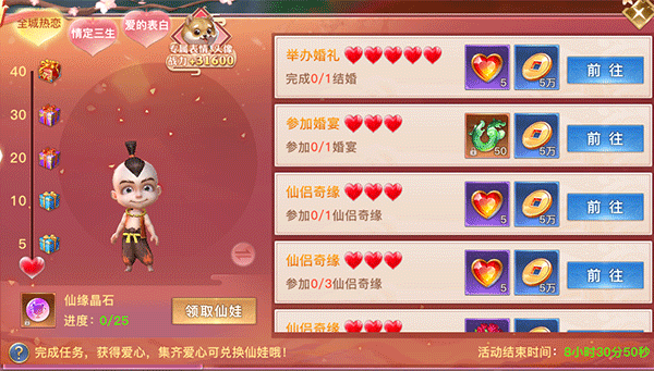 二、 全城热恋,完成任务获取爱心,集齐可兑换仙娃