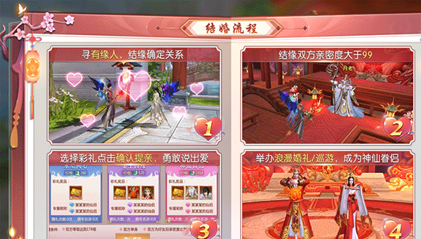 喜结良缘,培育仙娃,与仙侣携手共游太古仙界,成就神仙眷侣;结缘后即可获得仙侣奇缘额外次数、表白共享属性呢~!