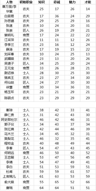下表列出了游戏中全体市民的初始职业及各项初始能力: