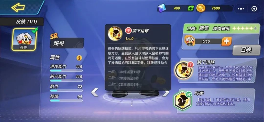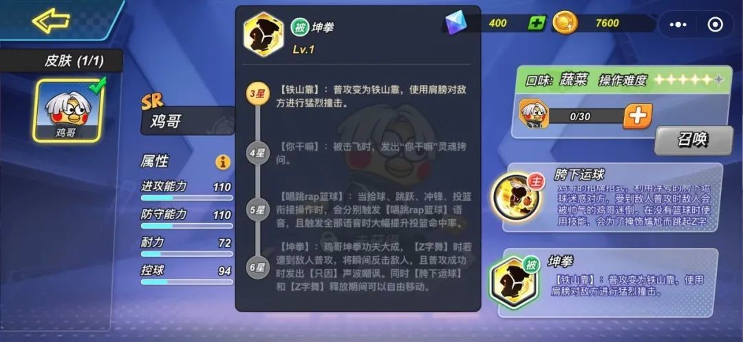 鸡哥坤拳功夫大成,[Z字舞] 时若遭到敌人普攻、将瞬间反击敌人,且普攻成功时发出[只因]声波嘲讽。同时[胯下运球]和[Z字舞]释放期间可以自由移动。