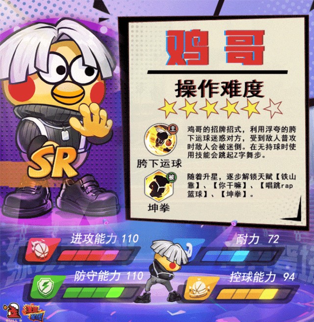 胯下运球是鸡哥的招牌招式,利用浮夸的胯下运球迷惑对方,受到敌人普攻时敌人会被帅气的鸡哥迷倒。