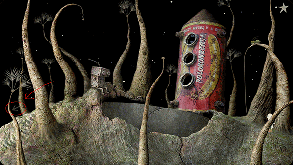 点人,要帮他找到烟斗。点斗笠上的铃铛,把它挂到那只鸟停着的树枝的左端,趁鸟飞起来的时候,点它的窝,烟斗掉下来。把烟斗给人。再帮他找烟袋。点人坐着的树桩下面的洞,狗跑进洞里。狗跑到怪物面前停下来,点狗身后的植物,狗就xuxu,植物就会长高(这个设计挺幽默)。然后点左边的水塘,狗跑过去喝水,回来再点植物。这样2、3次,植物长到顶端会有一个洞,点里面的骨头,给怪兽。烟袋藏在怪物后面的草堆里,找到烟袋,带上来给人。人点烟的时候会放出上面灯里的小飞虫,点飞虫就会为小人领路。过关。