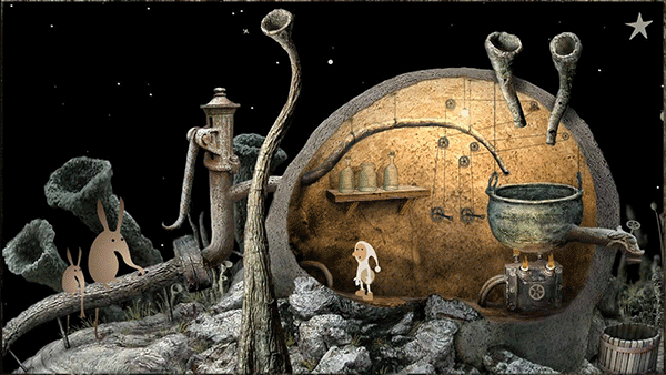 3、小人回到中间的房间,转动墙上中间的两个机关。点击右边的虫子,跳到最右边的树上,再点击跳到最左边的树上,粉撒入房间的锅子。点击房外左边向水泵一样的机关几下,水流进中间房间的锅子。