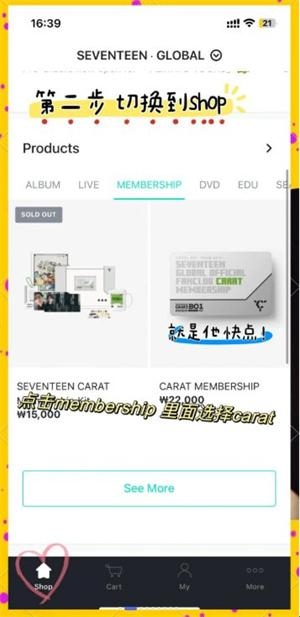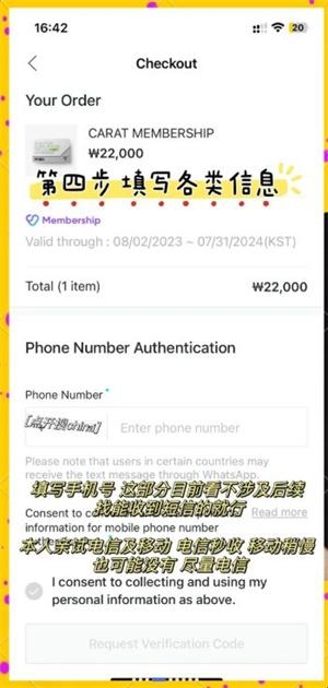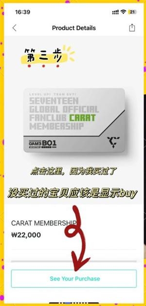 接下来,进入“Shop”页面,选择你想要的会员类型。比如,我要买CARAT MEMBERSHIP,价格是22,000韩元。点击购买按钮后,会进入一个填写信息的页面。