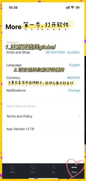 首先,打开你的Weverse软件。注意,要选择global版本哦。进入后,点击右下角的“More”按钮。