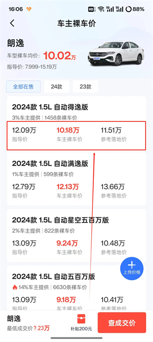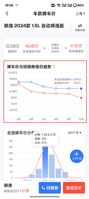 4、选择任意你想要查看的在售裸车价,还可以看到报价趋势、分布等数据;
