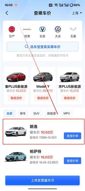 2、进入汽车报价界面后,选择你想要查询的车型,可下滑查看,下面以朗逸车型为例;