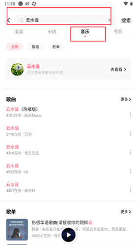 2、然后点击上方的搜索框,搜索自己喜欢的歌曲,然后点击音乐分类。