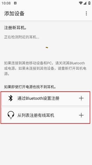 4、然后软件会开始进行检测搜索,如果搜索不到的话,可以点击“通过Bluetooth设置注册”或者“从列表注册有线耳机”。