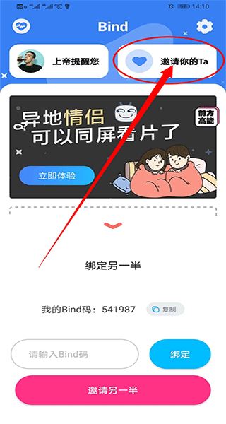 1、打开bind情侣定位软件,在首页点击上方的邀请,在下方弹出的界面中输入bind码进行绑定即可;