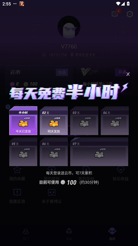 赛博云电脑为用户提供了多种获得游戏时长方式。一方面,用户可以通过每天签到领取体验时长。另一方面,如果用户对游戏体验有更高需求,也可以选择充值解锁所有限制,从而获得更畅快、更无拘无束的游戏体验。