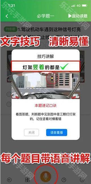 4、科一科四每个题目都能语音读题读答案技巧,关键词描红显示,文字技巧口诀与图文语音结合,文化低、认字少、记忆力差用上技巧告轻松通关。
