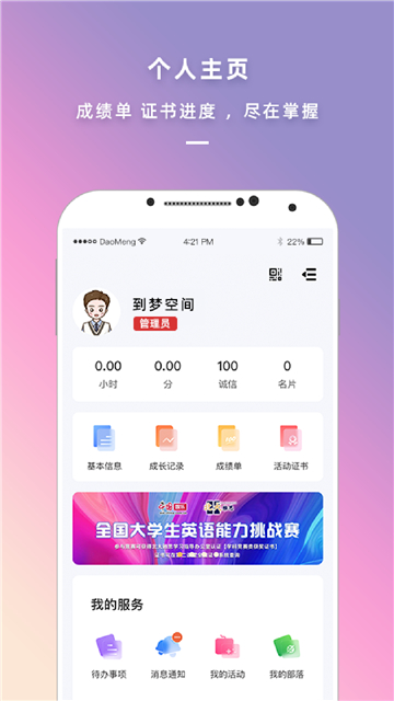 到梦空间管理系统不仅能够协助学生规划、发布和参加第二课堂活动,还能助力学生高效安排时间、提升素养,并帮助实现梦想,提供了校园活动、社团、通知等信息,还整合了日程表、教务系统对接等功能,方便学生全面管理学习、活动和生活。