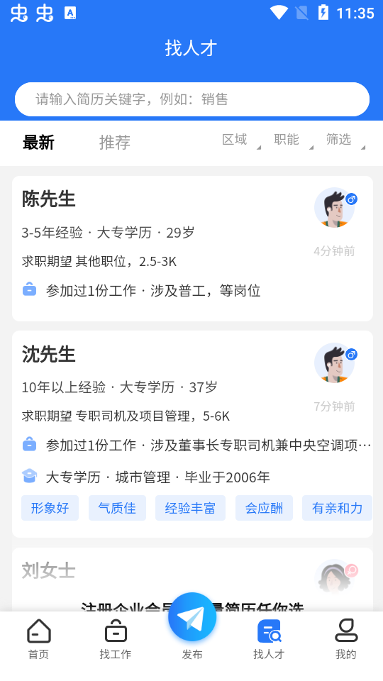 3、而在【找人才】页面,我们还能看到非常多的求职者信息,方便招聘者进行面试邀约。