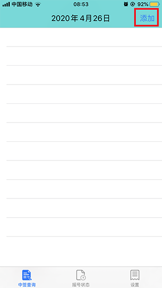 1、首先在手机上打开小客车摇号app,并在我们中签查询界面,点击添加可以新增摇号人员;