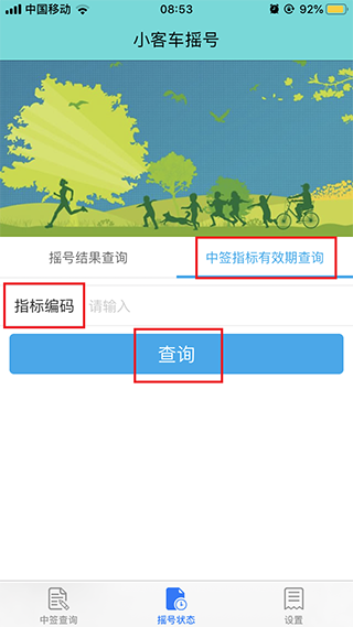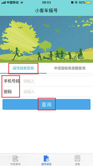 2、摇号状态界面,可以进行摇号结果查询,输入手机号和密码,点击查询即可;