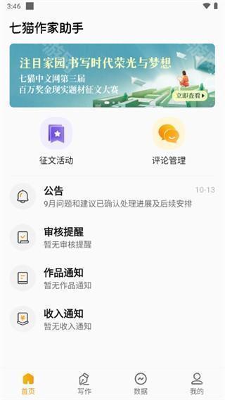 2、登录完成后在首页能后看到征文活动、作品通知、收入通知。