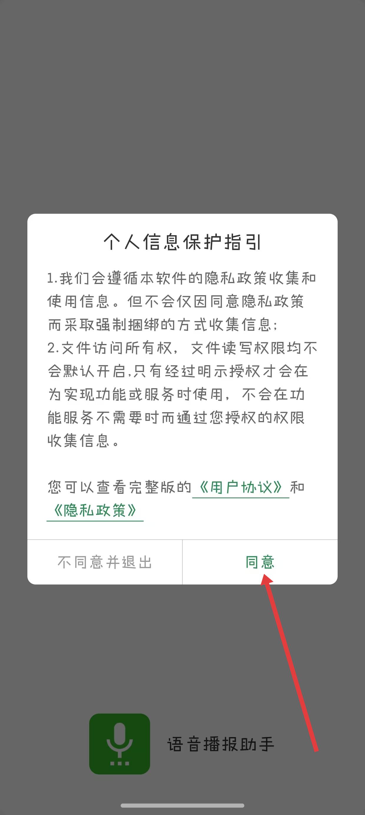 1、打开语音播报助手App,在弹出的个人信息保护指引界面,仔细阅读相关条款后,点击同意按钮,以继续使用该应用。
