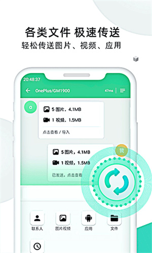【各类文件 极速传输】60秒极速换机,轻松传输通讯录、通话记录、图片、 音乐、视频、应用、电子书、等手机数据,速度高于蓝牙一百倍。