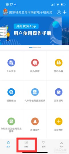 1、手机端打开河南税务app,在下方菜单栏点击【办税】。