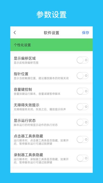 3、个性化功能支持:点击标记偏移区域显示、指针位置显示、工具条支持隐藏、点击器工具条定制、多脚本悬浮运行、脚本合并、多脚本悬浮单脚本运行、多脚本悬浮顺序运行、长按删除动作、脚本分享导入。