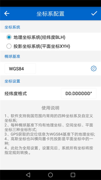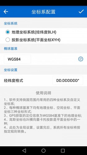 3、坐标测量。支持WGS-84,北京54、西安80、CGCS2000和自定义椭球基准,并支持七参数转换。