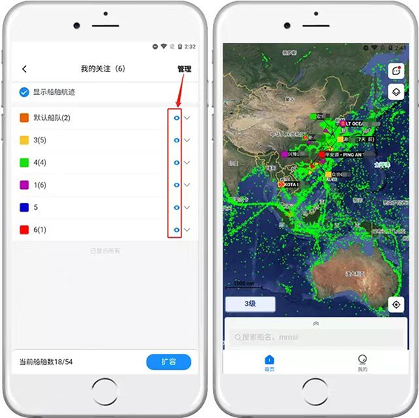 点击右上角的管理,点击组后面的“小眼睛”,就可以在地图上显示所选择组里的船舶了;