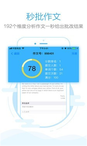 平台能实时对用户提交的作文进行批改,并立刻给出作文分数及分析反馈,让学生在写完作文后可以趁热打铁,迅速纠正作文存在的错误。
