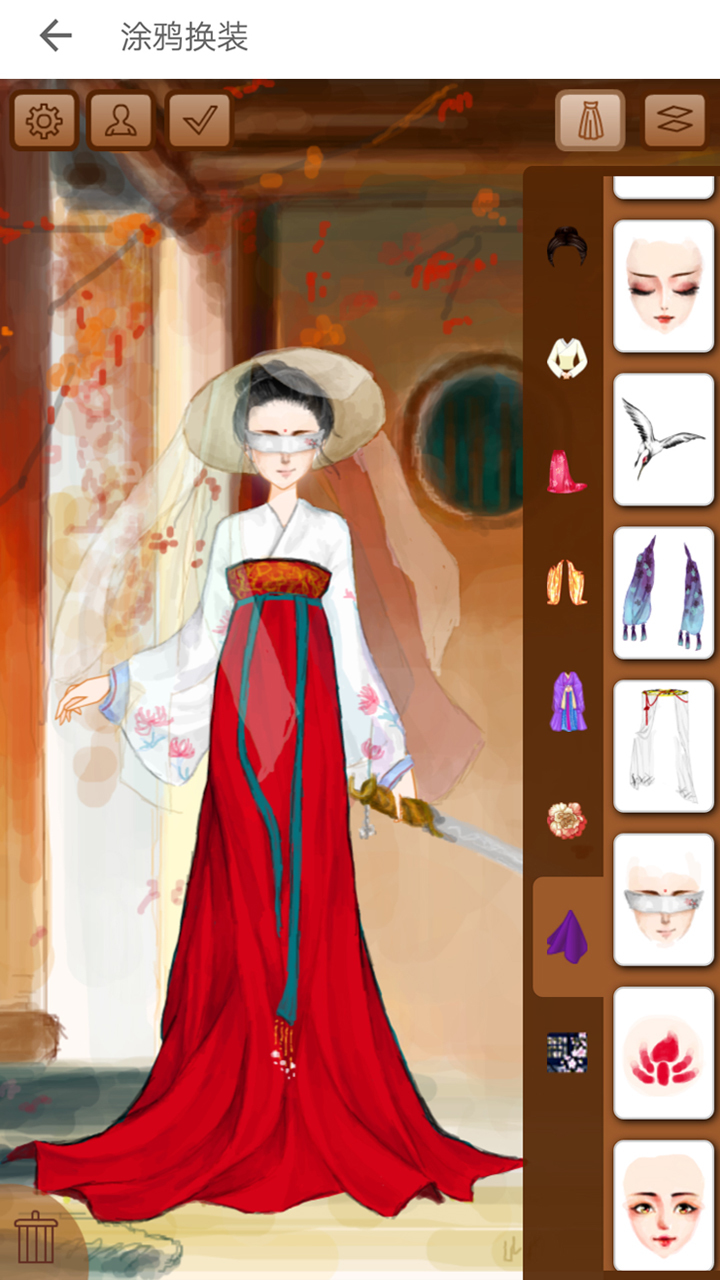 3.软件是古装的搭配应用,对于喜爱古装的人来说这是一次不错的创新机会,你可以根据自己喜欢的发型裙子外套以及套装头饰还有背景等等来进行自由搭配,手绘风格,让你无论怎么搭配都是一副美画。
