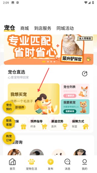 2、现在我们可以关于宠物的饲养指导、聚道等信息,接着点击【我想买宠】