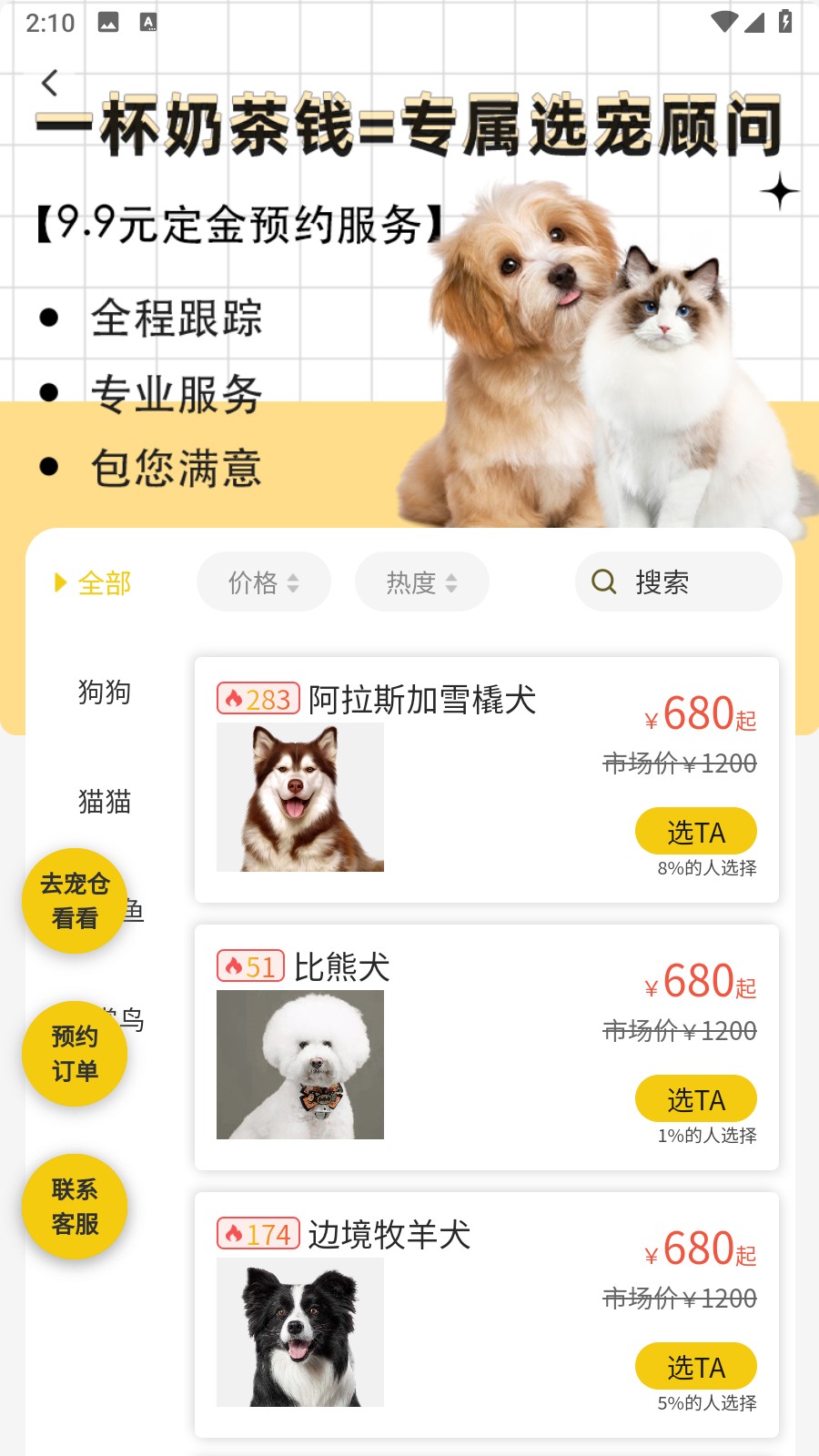 3、在页面左侧可以删选宠物类别,也可以自己手动搜索心仪的宠物