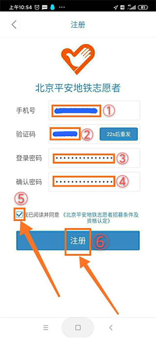 2、进入“注册”页面→输入手机号→点击“获取验证码”→填写手机收到短信的验证码→输入登录密码→确认密码→勾选“我已阅读并同意《北京平安地铁志愿者招募条件及资格认定》”→点击“注册”键→进入身份验证页面→需要用身份证拍照上传验证,也可以手动填写身份证号码信息验证;