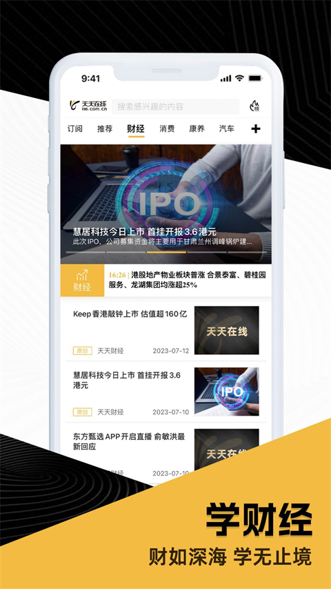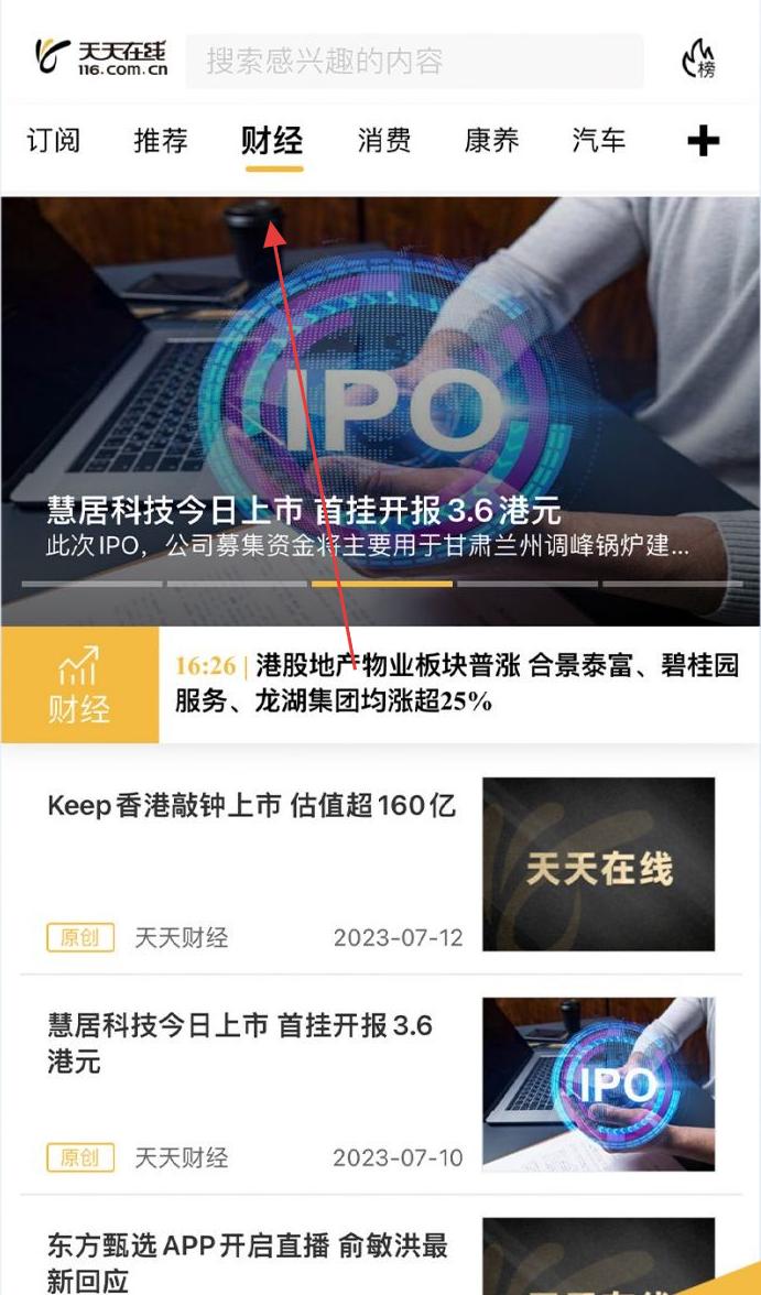 2、选中财经标签,能查看慧居科技上市、港股地产涨势等财经要闻,掌握金融市场动态。