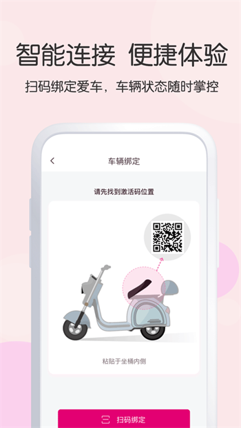4、选择扫码绑定注意二维码在坐桶内测,也可以手动输入激活码或车架号绑定。