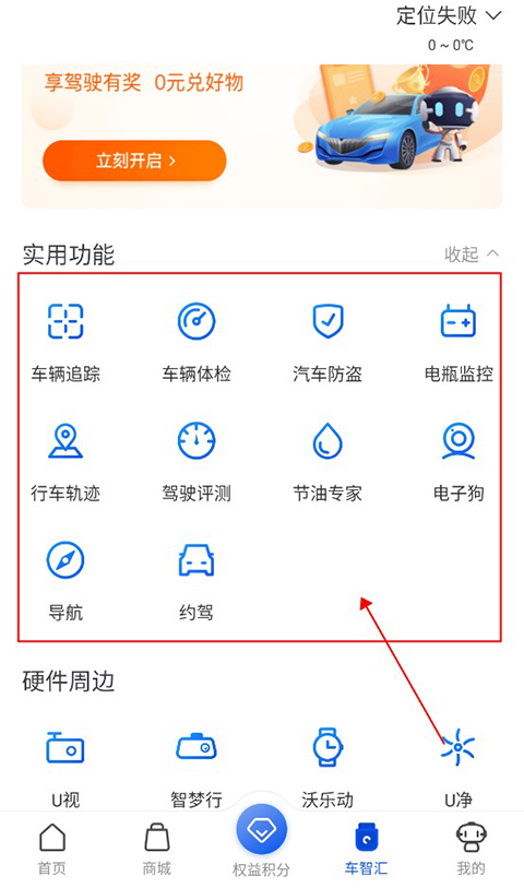 绑定好设备后,用户就可以回到“车智汇”页面,滑到下方查看硬件实用功能进行使用啦!