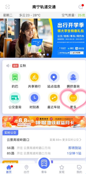 第一步:打开“南宁轨道交通APP”,首页找到“更多”按钮,点击进入。